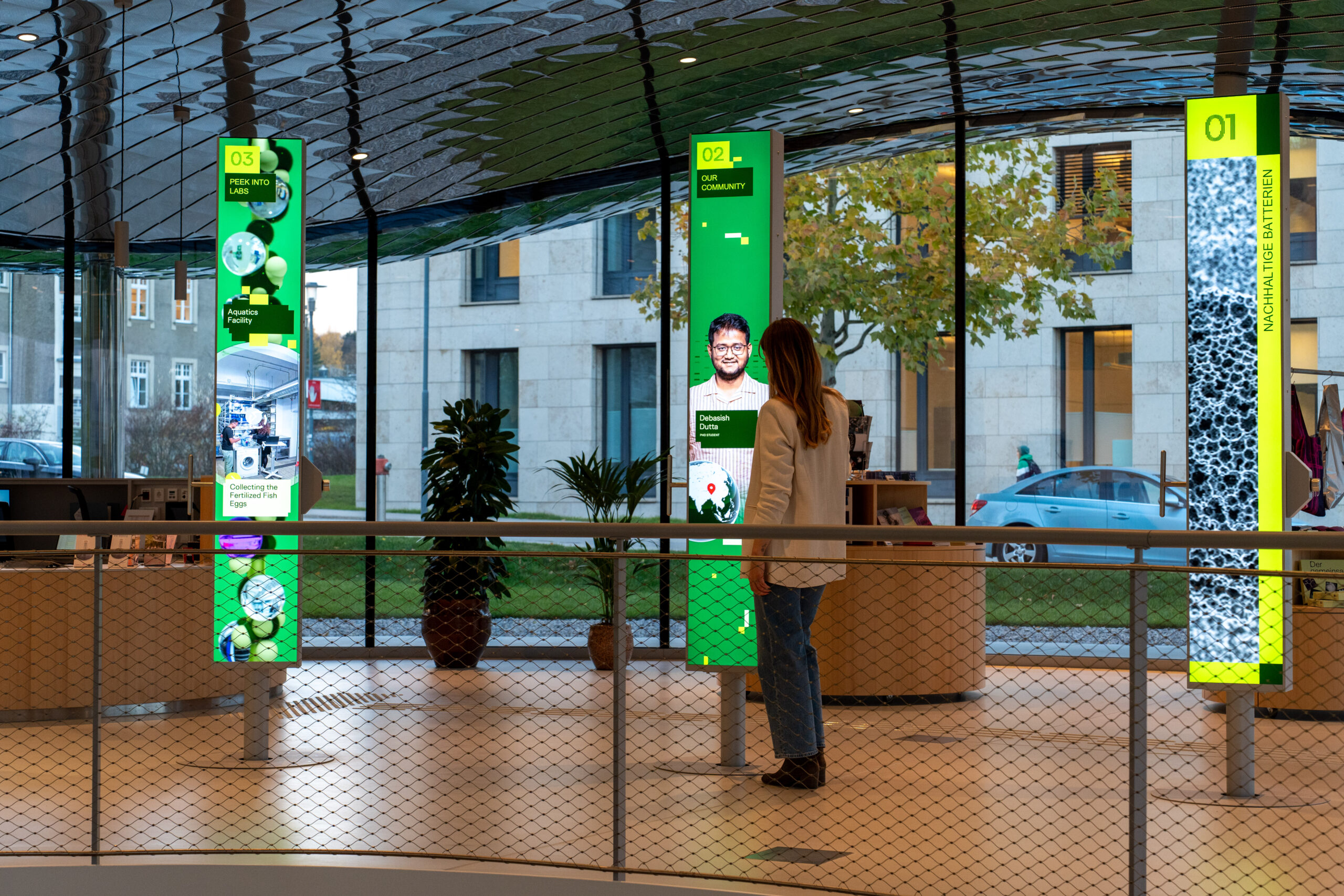 Sieben Display-Stelen sind in einer gedachten Linie positioniert und verbinden den Eingangsbereich mit dem Zentrum des Hauses. In Zusammenarbeit mit dem Architekturbüro Zirup entstand eine Installation, die digitale Inhalte räumlich integriert und den Schnittpunkt von Architektur und Interaktion markiert.